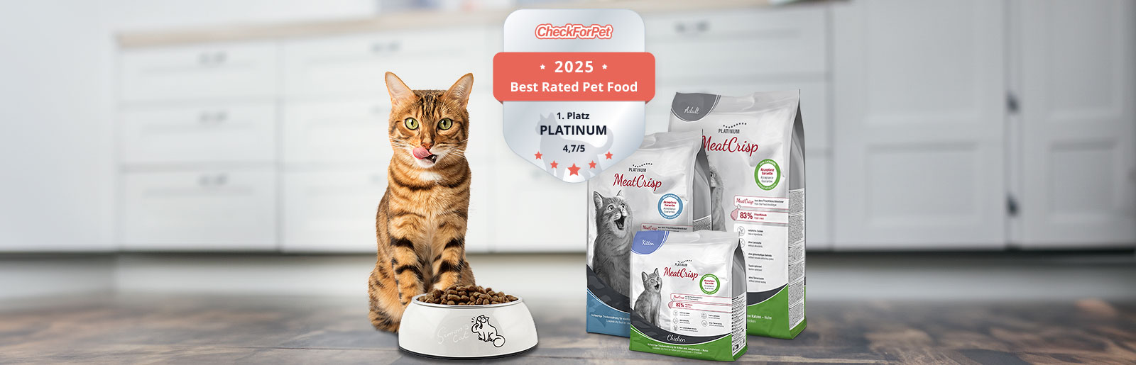 Unsere Katzennahrung MeatCrisp aus dem Frischfleischtrockner konnte überzeugen und steht beim unabhängigen Futtercheck CheckForPet auf Platz 1 – und das zum 3. Mal in Folge!