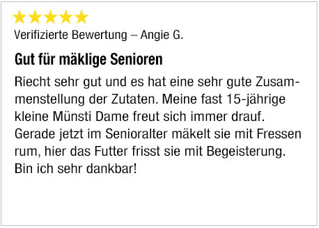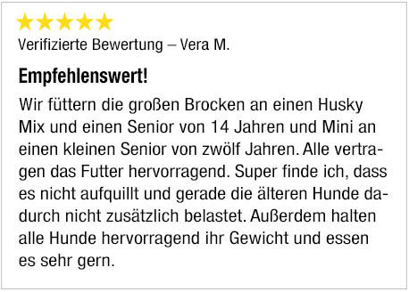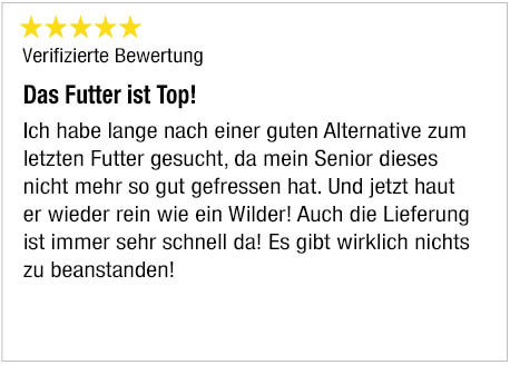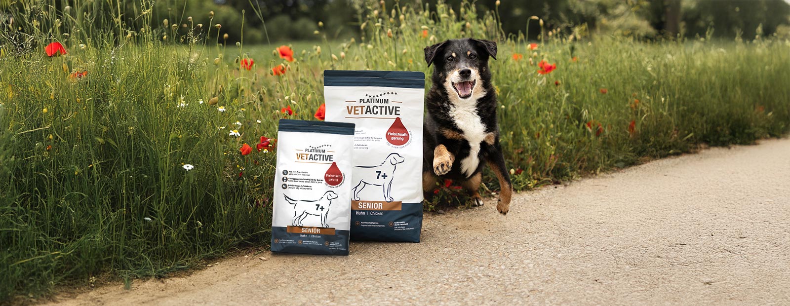Auch VETACTIVE Senior wird mit der einzigartigen Fleischsaftgarung zubereitet – einer schonenden Methode, bei dem Frischfleisch im eigenen Saft gegart wird. Dadurch quillt die Nahrung nicht im Magen auf und das Risiko einer Magendrehung wird verringert.