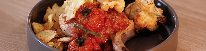 Gegrilltes Iberico-Kotelett mit Kartoffelchips, Brokkoli-Tempura & Tomatenmarmelade