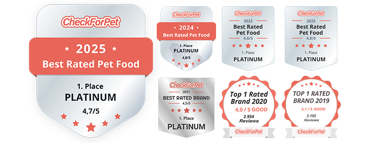 We stand out above all thanks to our dog food prepared with Fleischsaftgarung (FSG), strict quality standards and proximity to the customer. The success and approval – above all based on independent reviews by dog owners, such as CheckForPet’s Best Rated Brand in the pet food sector – proves us right. After all, rather than individual or specific test procedures, it is the experience of many dog lovers that ultimately determines which dog food brand impresses the most. We are extremely pleased that we have succeeded in doing so for our entire range of dog food and for several years in a row now.