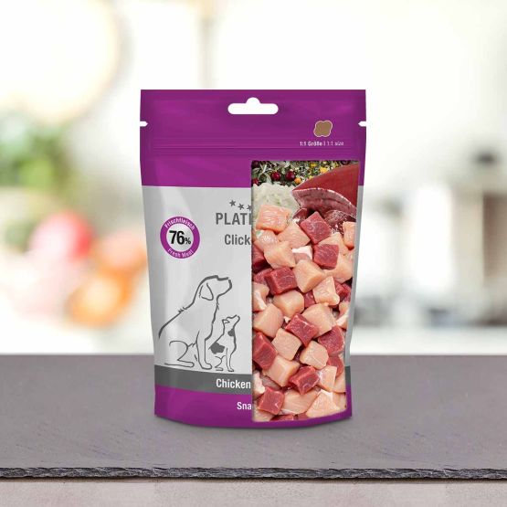 Nos snacks moelleux Click-Bits Chicken+Lamb ont été préparés par « Fleischsaftgarung » et conviennent parfaitement comme friandise entre deux repas ou comme récompense pour l'entraînement. La « Fleischsaftgarung » (cuisson dans le jus de viande) est une méthode particulière de préparation de la viande fraîche, qui trouve son origine dans la gastronomie, et non dans l’industrie de l’alimentation animale. Elle s'inspire des techniques souvent utilisées par les grands cuisiniers pour rendre la viande plus savoureuse et plus saine, grâce au jus de viande.